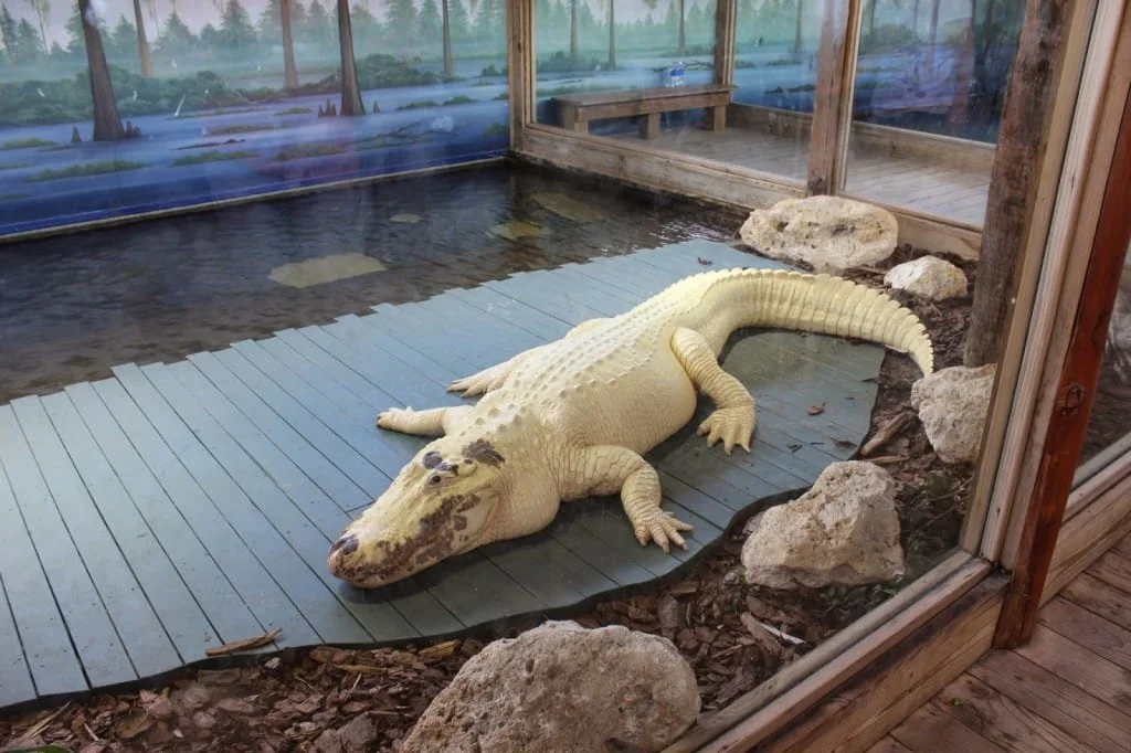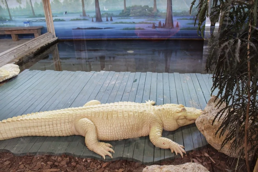Uma área que me chamou a atenção é a dos jacarés albinos. Eles são completamente brancos; parecem feitos de chocolate branco. É impressionante! Confesso que nunca tinha ouvido falar. Esses animais não ficam nos lagos e sim em tanques cobertos. Deduzo que o sol seja prejudicial para eles, como ocorre com os albinos de todas as espécies.