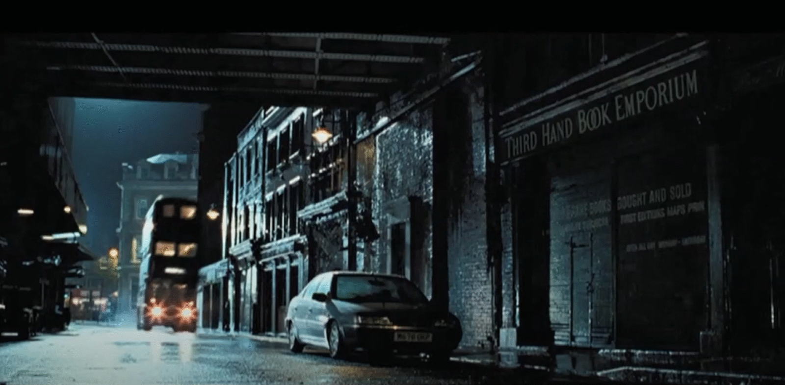 Curiosidade das filmagens: A produção pintou paredes, colocou placa de pub e até alterou vitrines vizinhas. Uma ótica virou o fictício “Third Hand Book Emporium”, em referência à loja de segunda mão do Beco Diagonal nos livros. A passarela de ferro do trem sobre a rua também aparece rapidamente quando o Nôitibus diminui de tamanho para passar.