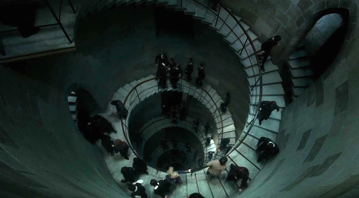 Curiosidade das filmagens: A escada foi construída no século XVII pelo arquiteto Christopher Wren e já apareceu em vários filmes, mas ganhou fama mundial por sua presença em Harry Potter. Ela não leva a nenhuma sala de aula na vida real, mas a produção usou sua estética única para criar o ambiente mágico da torre.