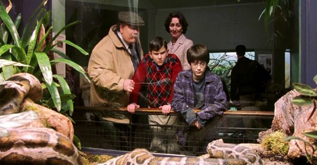 Cenas: Logo no início de Pedra Filosofal, Harry visita o zoológico com os Dursley e descobre que consegue falar com cobras. É dentro da Reptile House, no London Zoo, que ele conversa com uma píton e faz o vidro do terrário desaparecer, assustando Dudley.