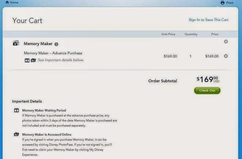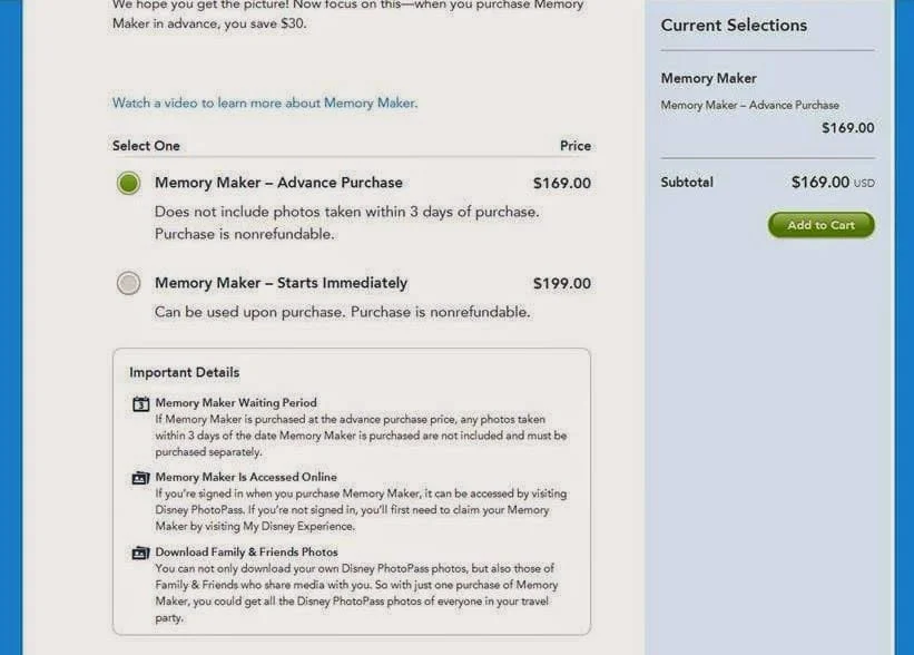 É possível comprar o Memory Maker pela internet com antecedência com desconto. Comprando com antecedência mínima de 3 dias antes da visita ao primeiro parque, o custo é de US$169,00. Se comprar faltando menos de 3 dias para a visita ao primeiro parque vai pagar US$199,00.