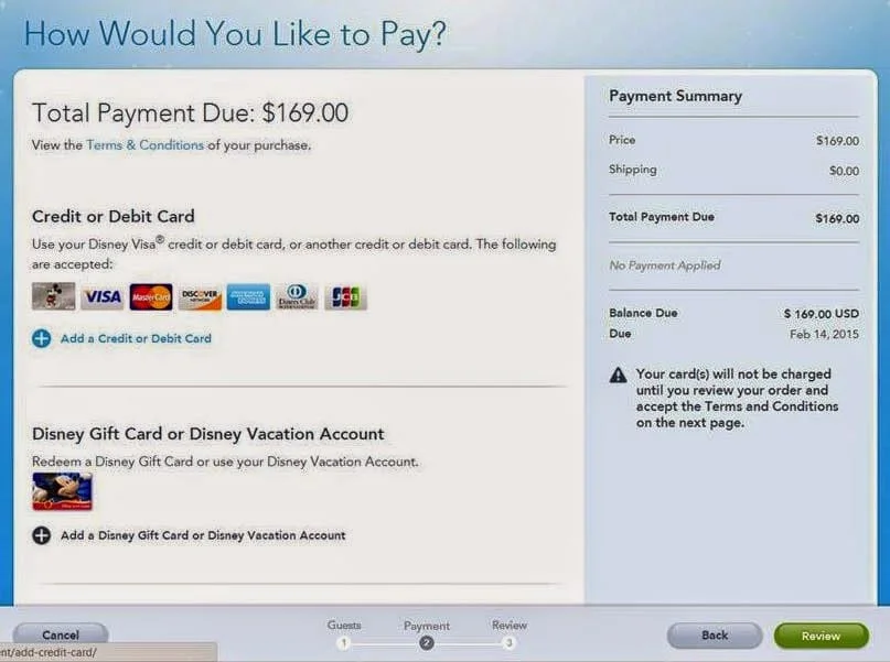 Na tela seguinte você deve selecionar o seu cartão de crédito e inserir os dados como número e endereço do cartão e clicar em Review. Será aberta outra tela de confirmação, se tudo estiver ok, apenas conclua a compra.