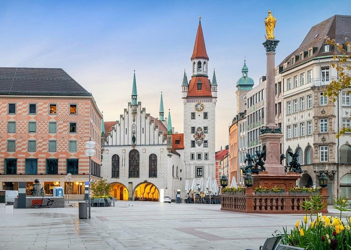 A Marienplatz é o coração pulsante de Munique desde 1158. O destaque absoluto é a Nova Prefeitura, um edifício em estilo neogótico que domina a praça com sua torre imponente e fachada ricamente adornada. É aqui que se encontra o famoso Glockenspiel, o carrilhão que encanta multidões diariamente às 11h e 12h (e também às 17h durante o verão). O espetáculo dura cerca de 12 minutos e apresenta 32 figuras de tamanho natural que encenam o casamento do Duque Guilherme V e a tradicional dança dos tanoeiros, que simboliza a perseverança da população após uma epidemia de peste. No centro da praça, a Mariensäule (Coluna de Maria) celebra o fim da ocupação sueca durante a Guerra dos Trinta Anos. Passeio gratuito.