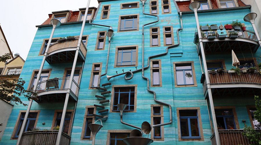 O Kunsthofpassage Dresden é um conjunto de pátios criativos escondidos na Neustadt, cada um com um tema diferente. As fachadas têm intervenções artísticas, instalações curiosas e detalhes que rendem fotos ótimas, como o famoso prédio azul com “tubos musicais”.