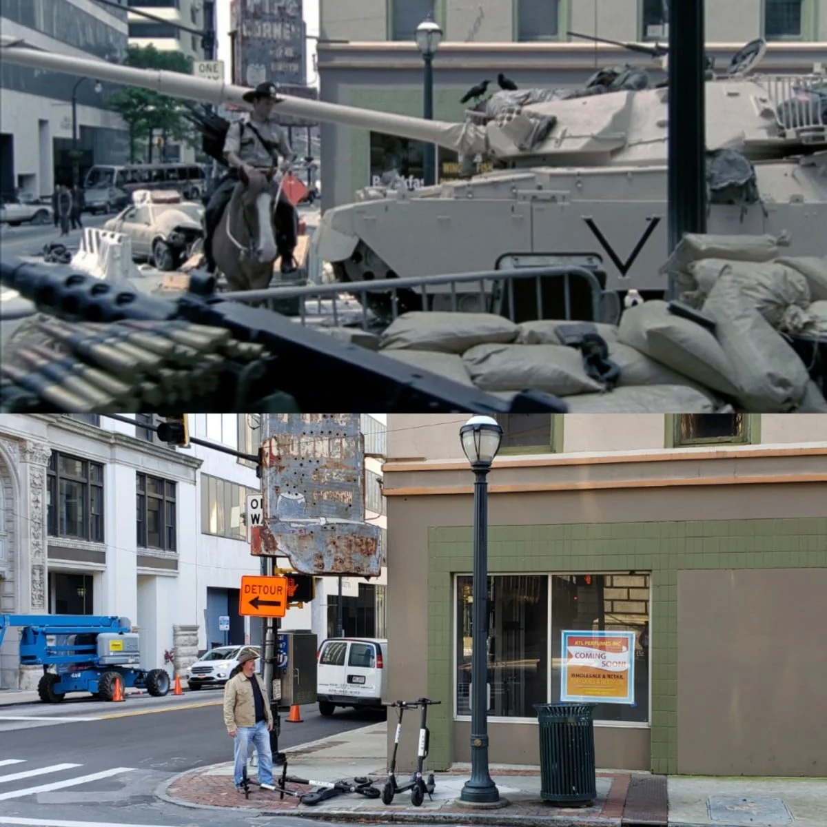 Rick encontra um tanque – Mais 10 minutos adiante, já no centro de Atlanta, está a esquina onde o Rick se depara com um tanque do exército no primeiro episódio da série, quando está montado num cavalo. Depois de ver um grupo de zumbis, ele acaba entrando no tanque. 49 Forsyth St NW, Atlanta, esquina com a Walton St.