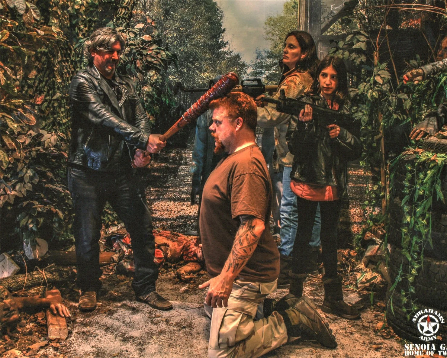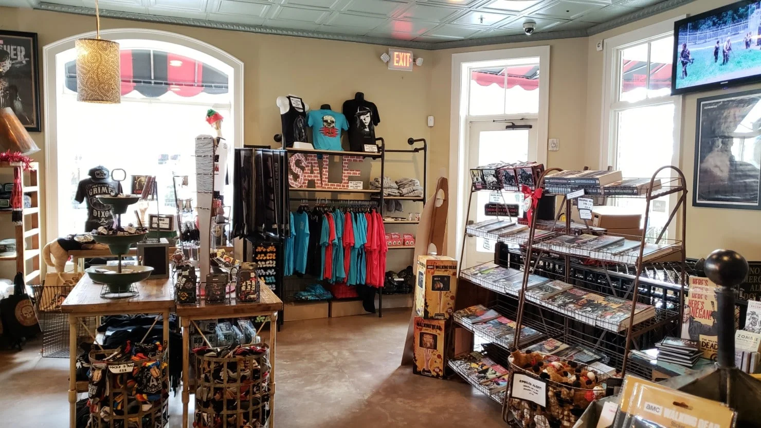 Loja e museu – Ali pertinho fica a loja The Walking Dead Store, uma loja com muitos artigos da série. São roupas, acessórios, artigos de decoração… Nós compramos uma Lucille para decorar a nossa sala 🙂 . Embaixo da loja fica um mini museu com algumas peças da série, inclusive a famosa porta do hospital onde o Rick acorda do coma. Não tem custo para visitar o museu. E ali mesmo tem um cara que é sósia do Abraham e faz umas fotos num cenário. Ele tem as roupas, armas e uma Lucille. Bem engraçado! Claro que fizemos, né 😀 48 Main St, Senoia.
