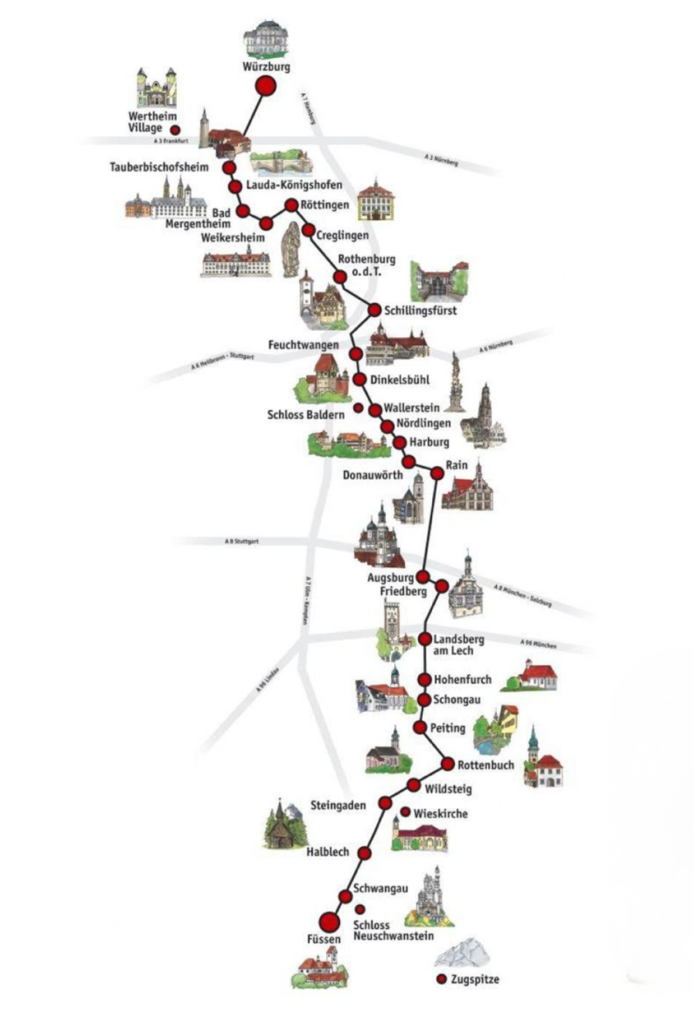 A Rota Romântica é organizada como um percurso linear simples de seguir, sempre indicado pelos famosos sinais marrom-claros ao longo da estrada. No mapa oficial, o trajeto aparece como uma linha contínua que desce pelo interior da Baviera, passando por 27 cidades; algumas bem pequenas, outras maiores, todas conectadas por estradas tranquilas e bem cuidadas.