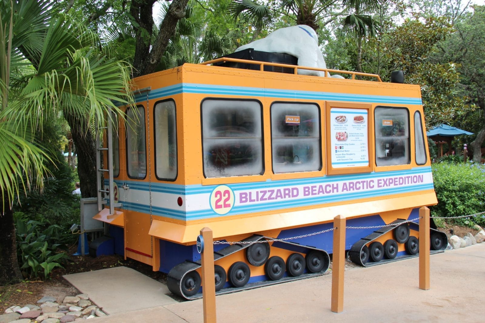 Uma das coisas que eu mais gosto no Blizzard Beach é o visual imitando uma estação de esqui. Existe uma lenda (de mentira, é claro) que a Flórida teria sofrido uma nevasca e que ali havia sido instalado um resort de esqui, porém com muita neve derretida, as pistas teriam se transformado em tobogãs que caem diretamente nas inúmeras piscinas.