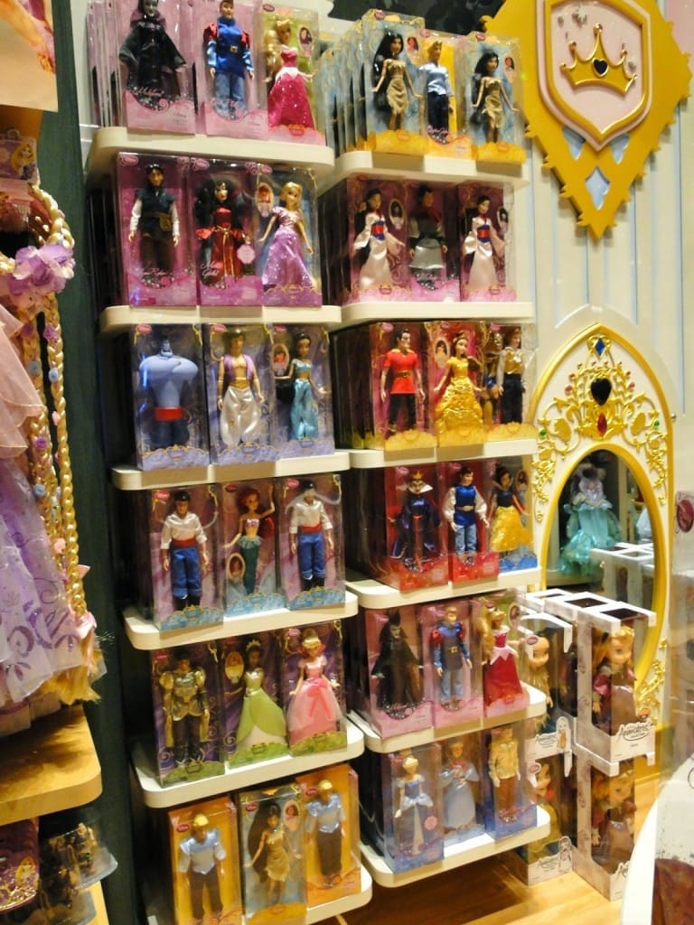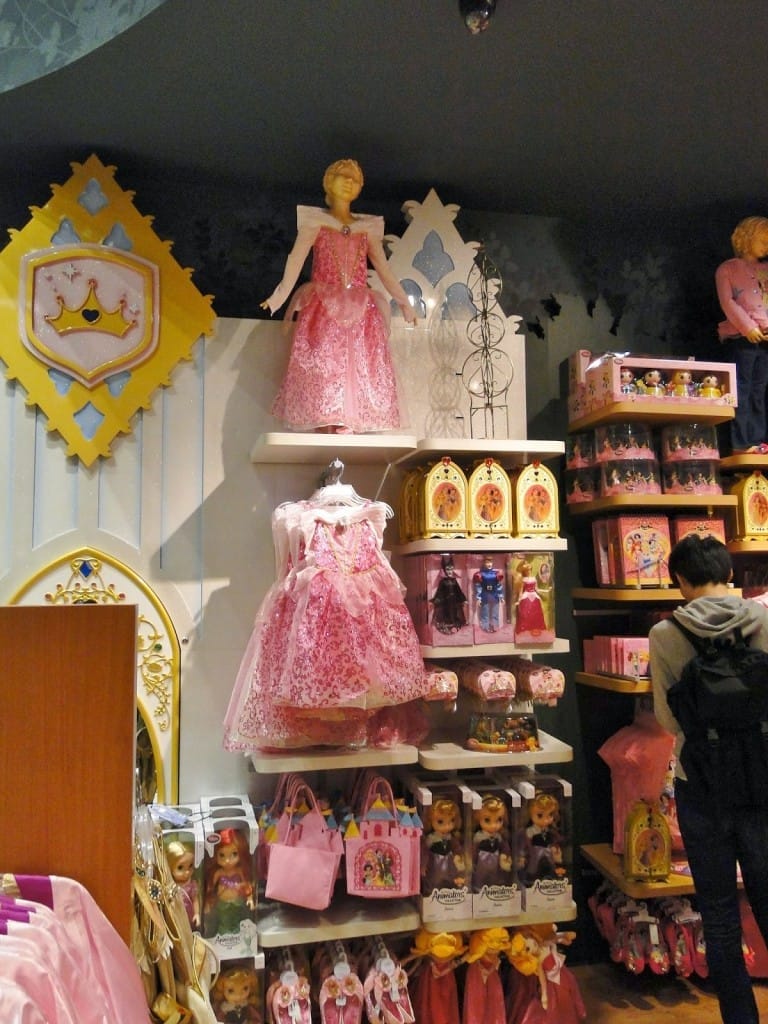 Numa determinada área existe uma entrada feita por um castelo. Ali dentro está toda a linha das princesas, com bonecas, fantasias, camisolas que parecem vestidos longos, roupas, acessórios…