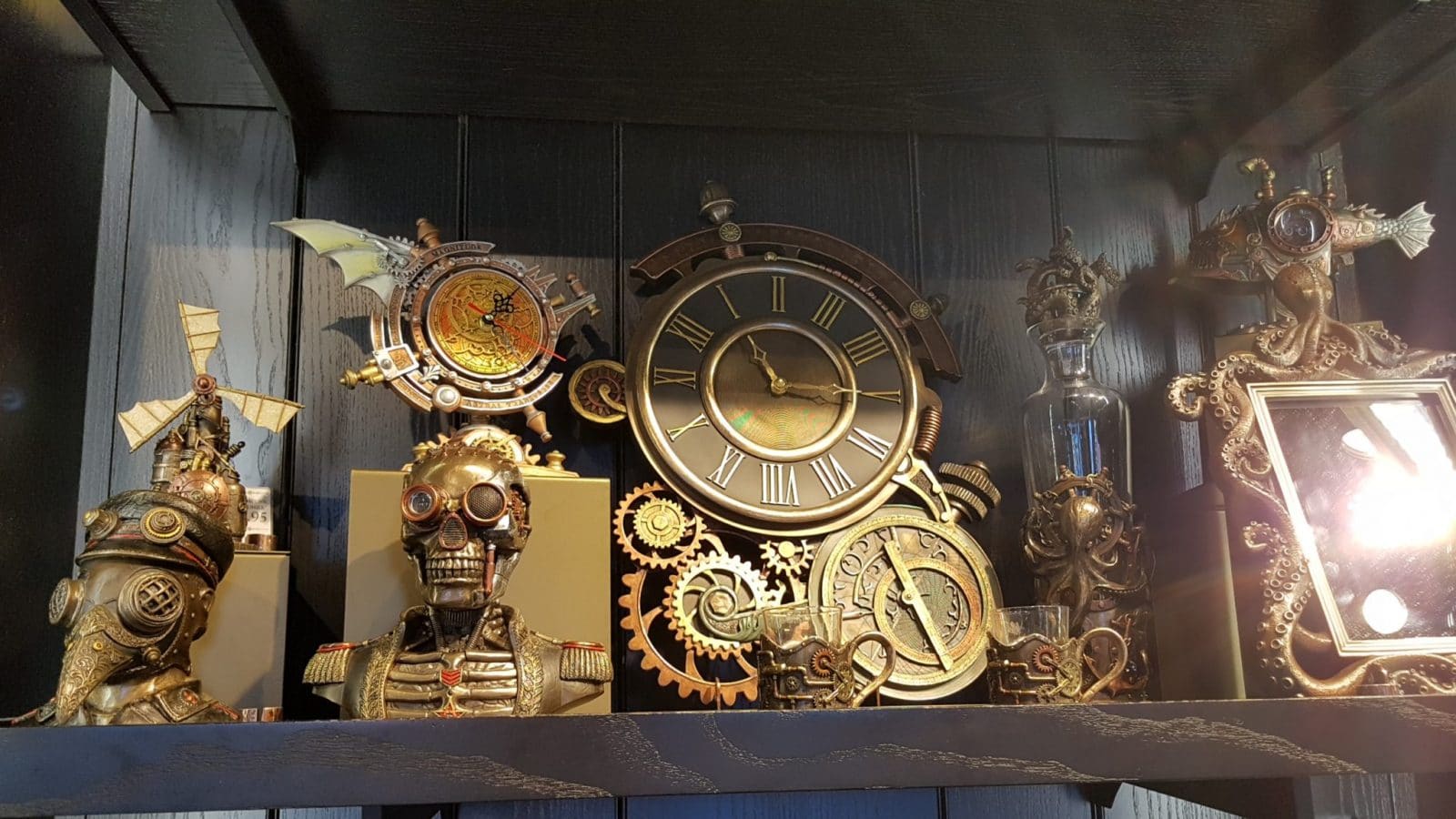 Por falar em decoração, o local é super bem decorado, cheio de detalhes. Em algumas estantes você encontra um monte de cacarecos e engenhocas, exatamente como alguns filmes do gênero. Algumas estão à venda, inclusive.