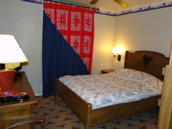 Na nossa primeira visita ficamos nos quartos com decoração “western” que compreendem as categorias Standard, Buffalo e Rio Grande Rooms. São quartos com uma cama de casal e uma beliche; tudo bem rústico e divertido. Vários elementos cowboys fazem parte da decoração. O banheiro possui banheira e tem um bom tamanho. As crianças costumam adorar a beliche!