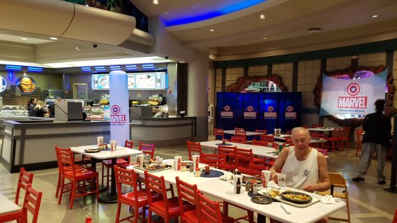Esse restaurante opera como uma lanchonete de pratos rápidos durante o dia e durante o Marvel Character Dining se transforma num restaurante buffet para receber o evento à noite.