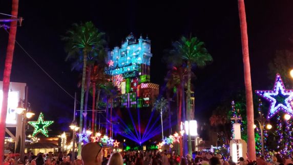 Já na Sunset Boulevard, assim que escurece, ocorre o Sunset Seasons Greetings, um show de projeção na Tower of Terror. São 4 sequências diferentes, uma com Toy Story, Mickey e Minnie, Olaf e Muppets. E neva na rua. Claro que não é neve de verdade e sim neve de espuma, mas quem se importa? 🙂