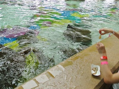 A Stingray Lagoon fica praticamente ao lado da Dolphin Cove, e bem perto da Manta.  Dica: Se seu filho for pequeno, menor de uns 10 anos, leve uma outra camiseta, pois ao apoiar para acariciar as arraias, minha filha molhou a roupa. Como estava bem quente, secou rápido, mas se não estiver…